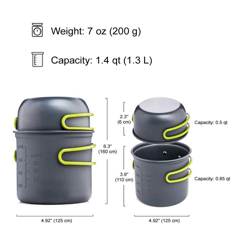 Made from hard anodized aluminum, this ultralight two-pot set combines strength and portability for outdoor cooking. Featuring a clever nesting design, it allows you to store an 8 oz (230 g) gas canister and an ultralight stove inside, maximizing space in your backpack. The foldable handles, precise measurement markings, and included mesh storage bag make this an essential cooking companion for any outdoor adventure.